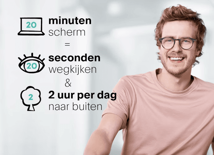 Na elke 20 minuten dichtbij kijken (zoals lezen of schermgebruik), kijk 20 seconden naar iets op minstens 6 meter afstand. Daarnaast is het belangrijk om dagelijks minimaal 2 uur buiten te zijn. Dit helpt bij het ontspannen van je ogen en het voorkomen van bijziendheid.